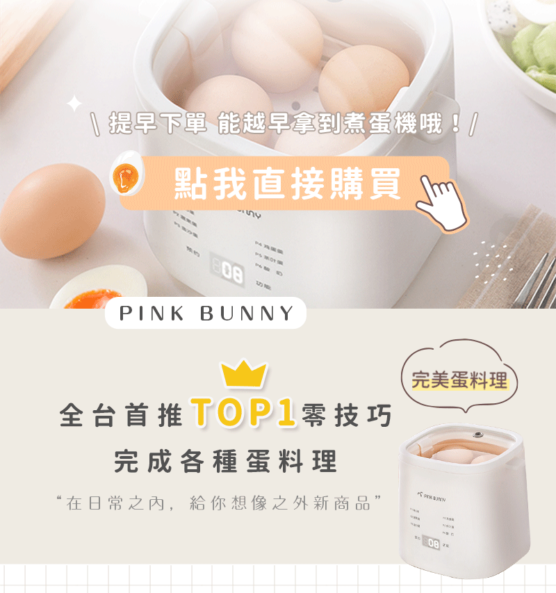 半小時前Pink Bunny智能煮蛋機智能控溫烹煮,營養美味輕鬆上桌 - Pink Bunny智能煮蛋機2入組 NT$1990